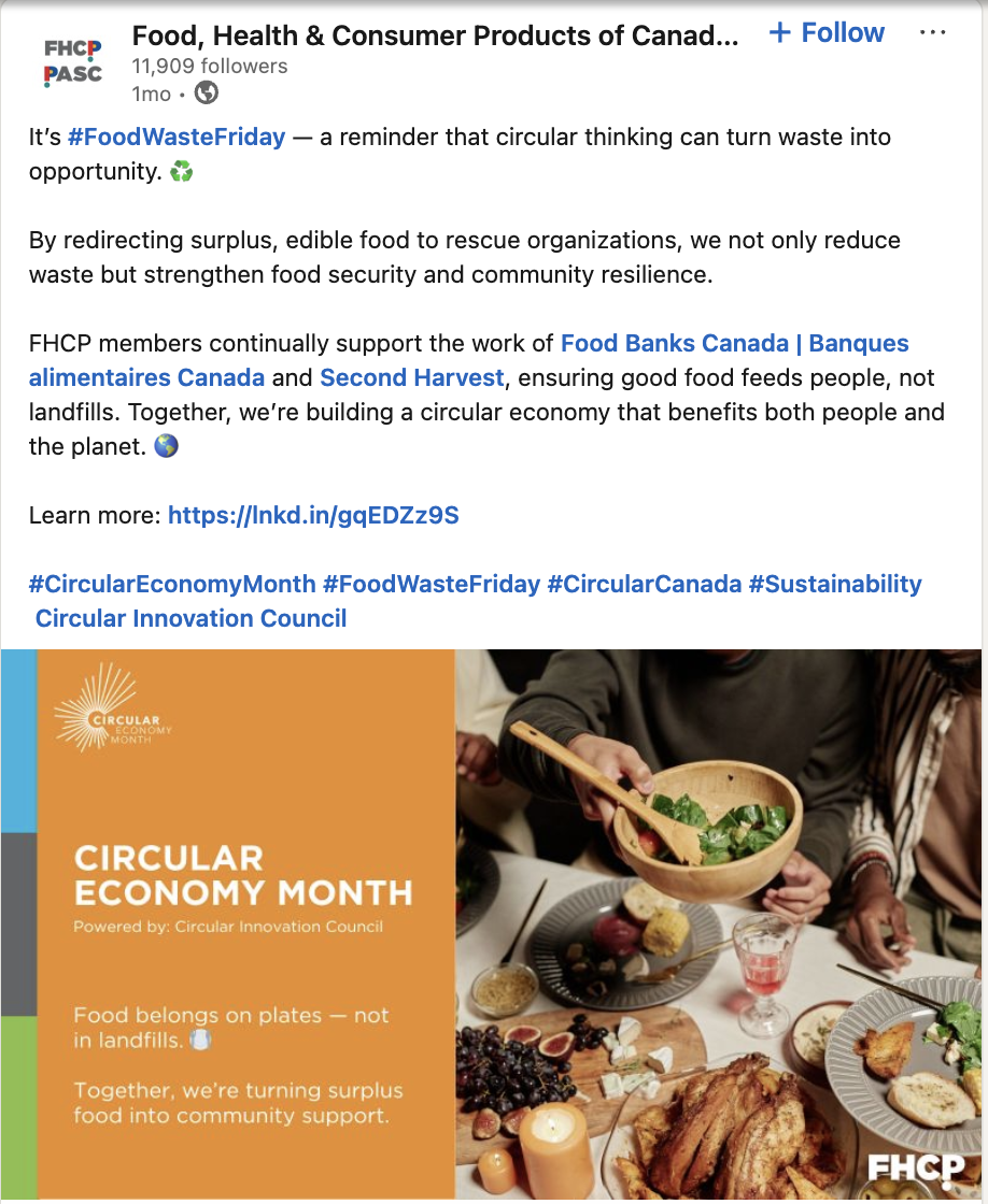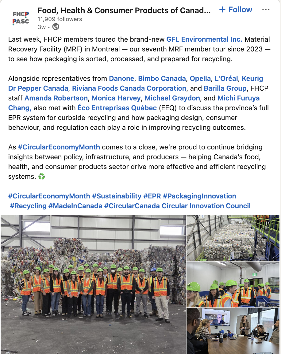 Food, Health & Consumer Products of Canada (FHCP) members toured the new GFL Material Recovery Facility in Montreal to see how packaging is sorted processed and prepared for recycling. FHCP also participated on social media throughout the month, aligning with campaign themes like Food Waste Friday.