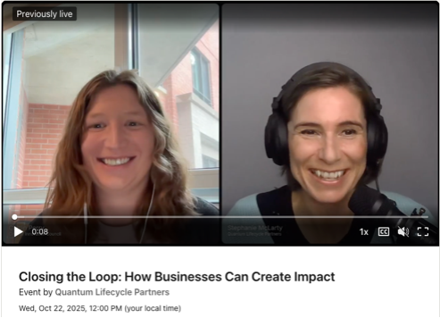 Quantum Lifecycle Partners LinkedIn live – Circular Economy Month’s Program Manager, Caitlin Perry joined Stephanie McLarty in a dynamic LinkedIn live conversation on E-Waste Wednesday. The conversation covered what Circular Economy Month is all about, why embracing circularity is a smart move for businesses, and simple actionable steps businesses can take to reduce waste and build circular practices. Watch the replay on LinkedIn.