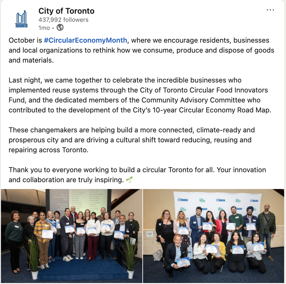The City of Toronto: came together to celebrate the incredible businesses who implemented reuse systems through the City of Toronto Circular Food Innovators Fund, and the dedicated members of the Community Advisory Committee who contributed to the development of the City’s 10-year Circular Economy Road Map.