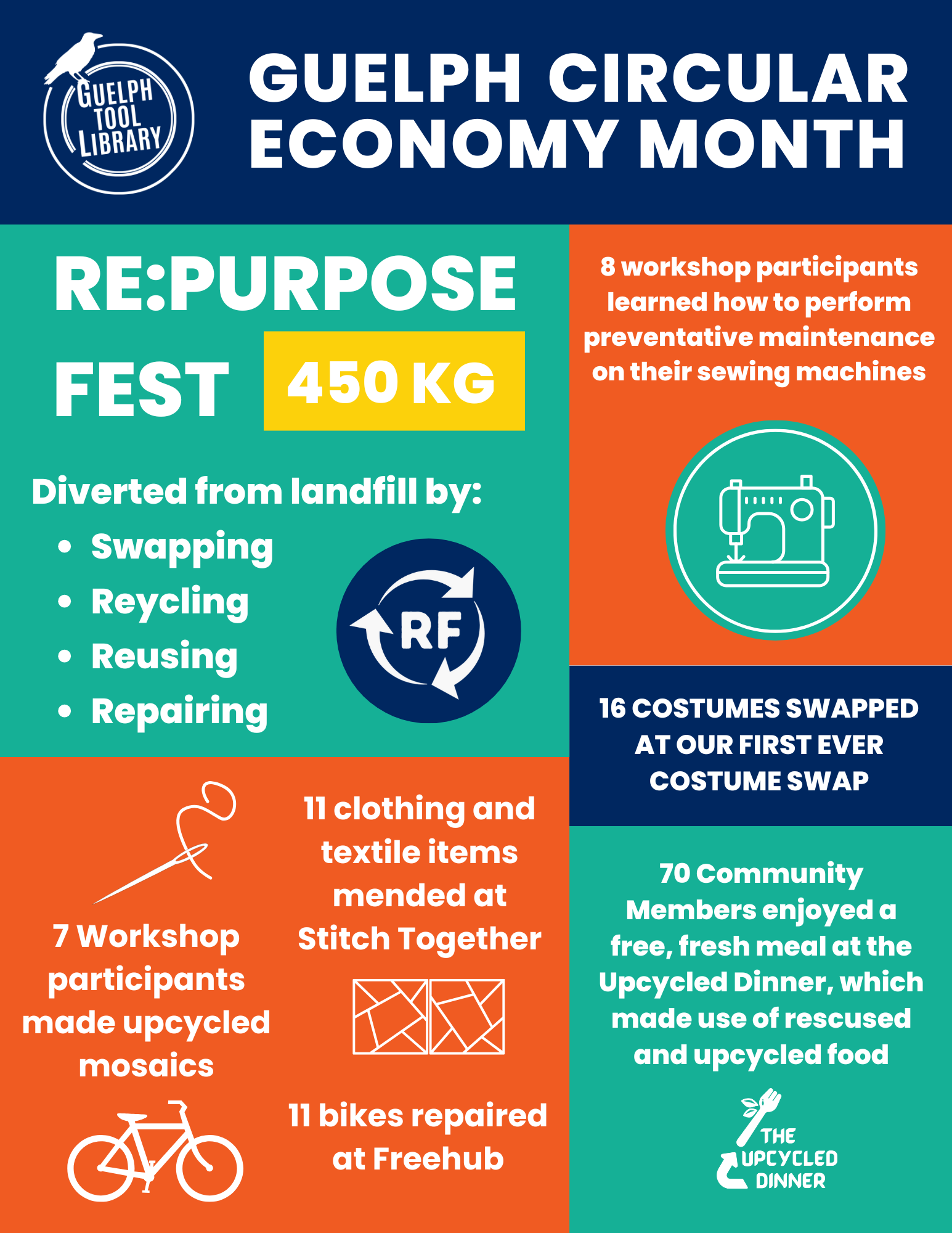 Guelph, ON community events: the Guelph Tool Library held a series of events throughout October such as a Re:Purpose Fest, Costume Swap, and Upcycled Dinner.